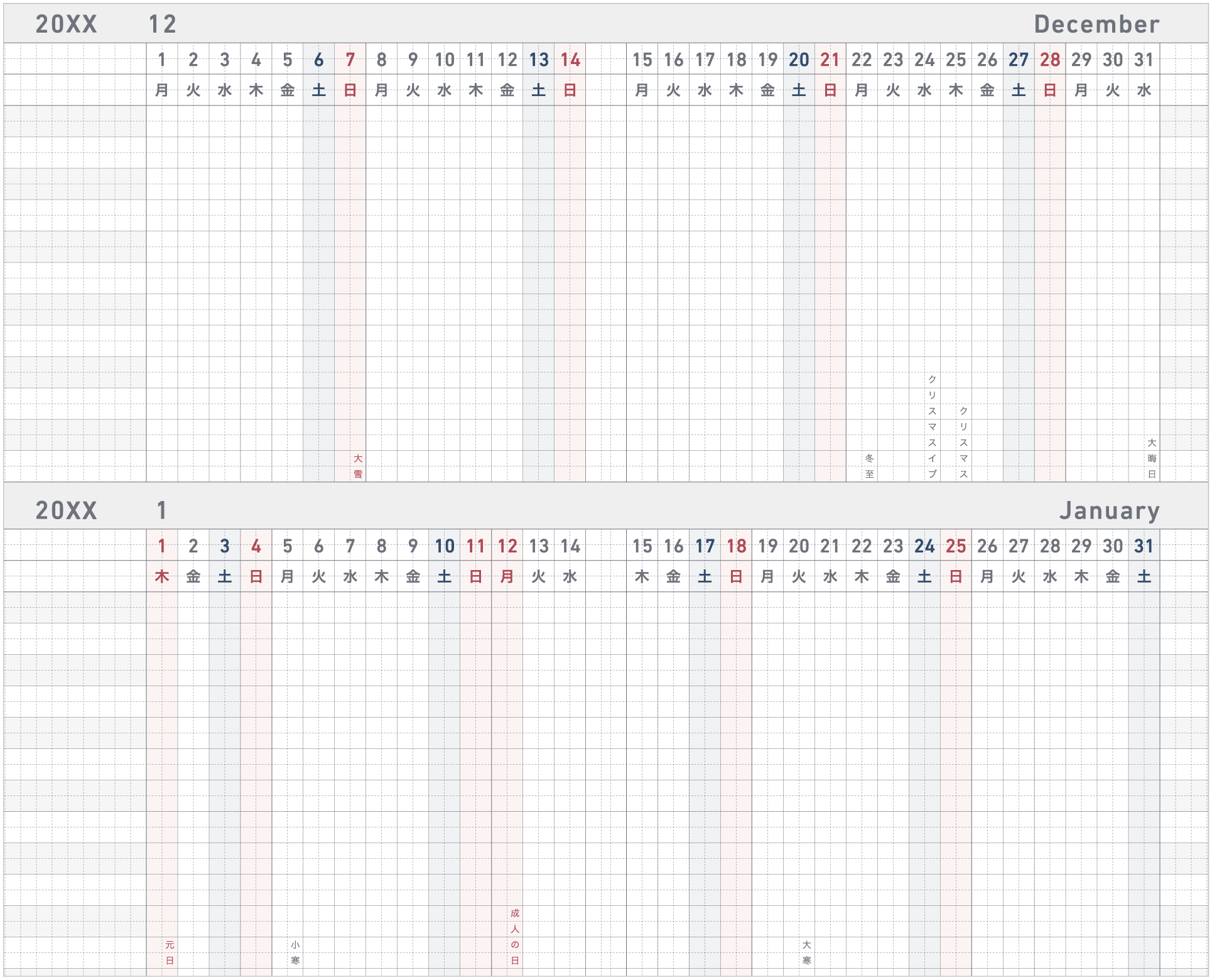 二ヶ月単位で俯瞰できるので、ビジネスシーンでは案件の進捗管理に最適です。