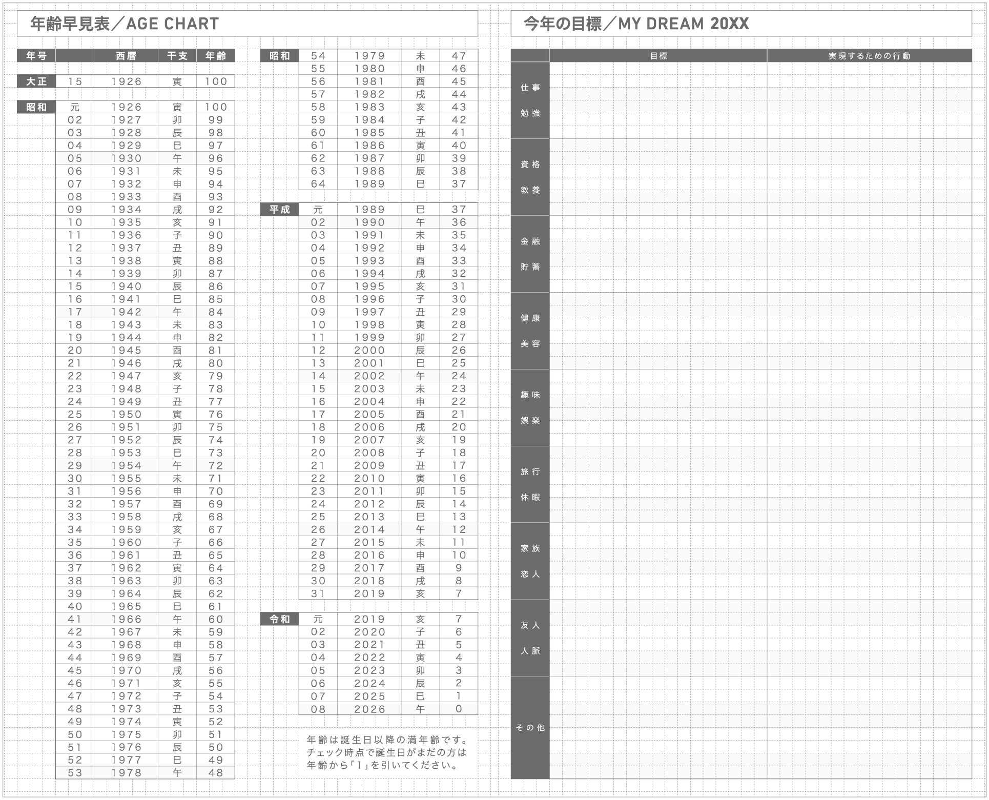 仕事の目標、人間関係の目標などカテゴリーに分けて一年間で達成したいことを書き出せます。(左は年齢早見表)