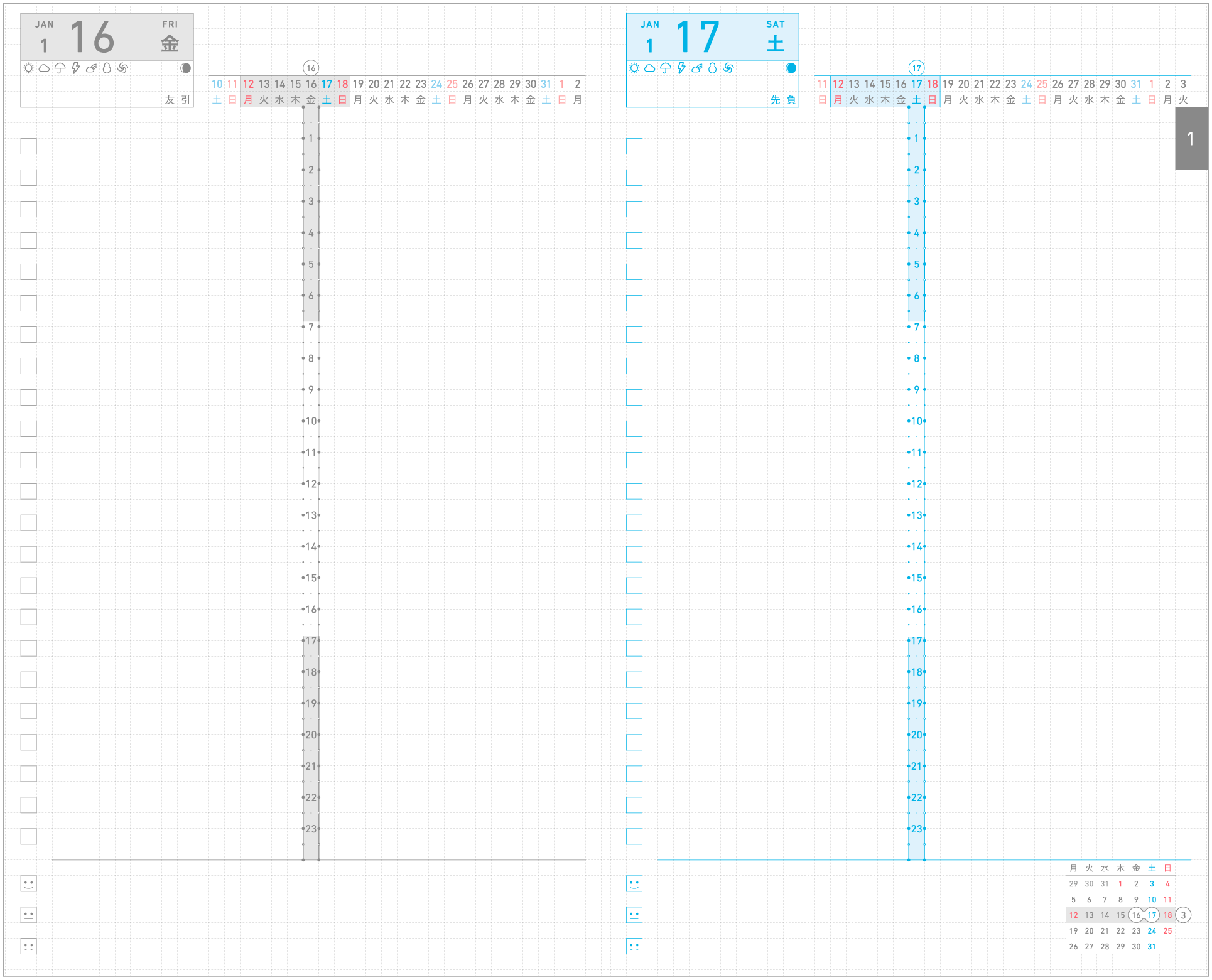 1日1ページ形式ながら、左右で異なる内容を書き分けられる【T型タイムライン】の罫線です。時間軸の上部に3週間分の日にちの日付。次の日になったら横軸が1マス左にずれることで1週間の中での位置が把握しやすくなりました。