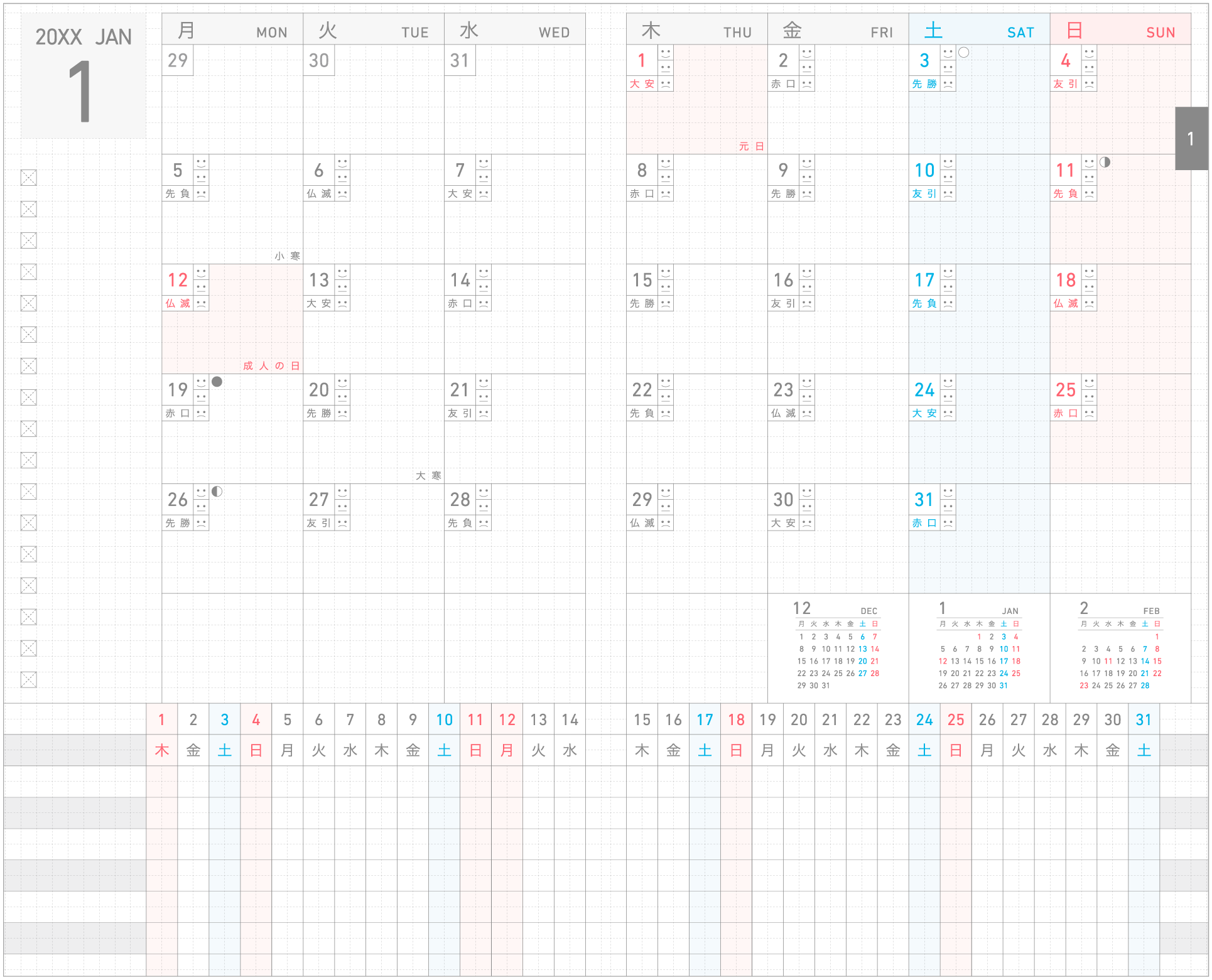 月の予定と習慣記録を同時に俯瞰できるページ。下は工程管理を記録するなどさまざまな使い方ができます。