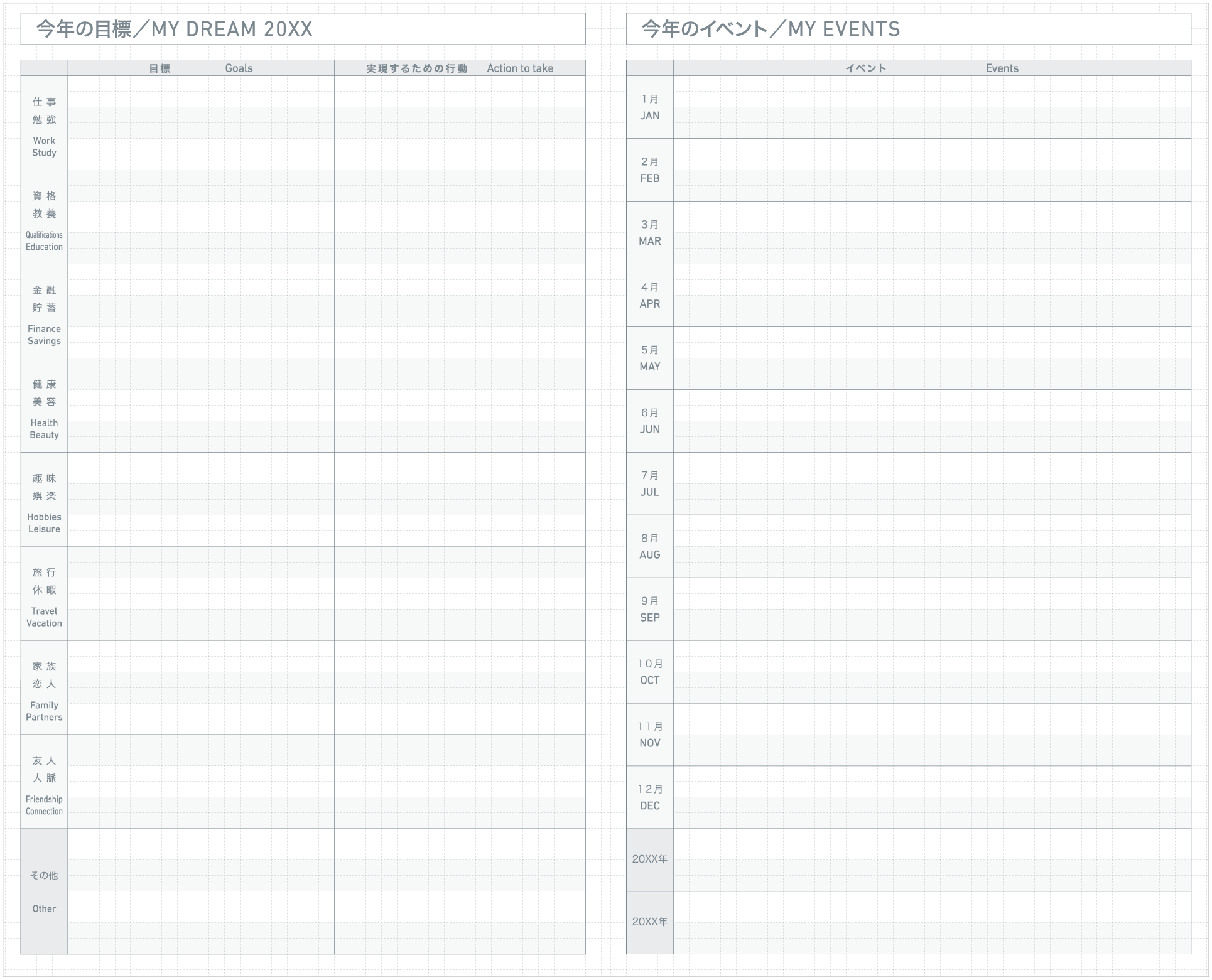 1年の目標と、月ごとのイベントをまとめて書けます。分冊のため前半は1~12月、後半は7~12月に分かれています。