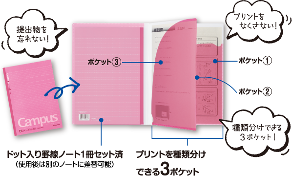 ※ノートは、キャンパスノート(ドット入り罫線・カラー表紙)(普通横罫) の1色が1冊セットされています。