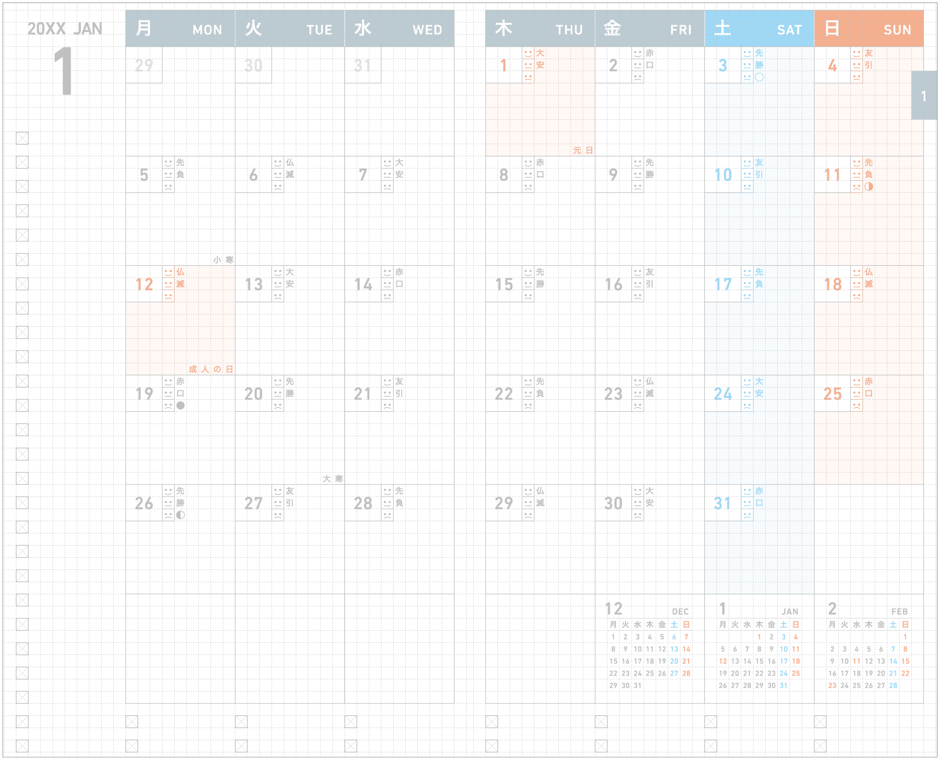 一ヶ月を俯瞰できるブロック型のダイアリー。1日が週の途中から始まる月は前月の終わりも表示し、見やすくなっています。翌年3月まで使えます。