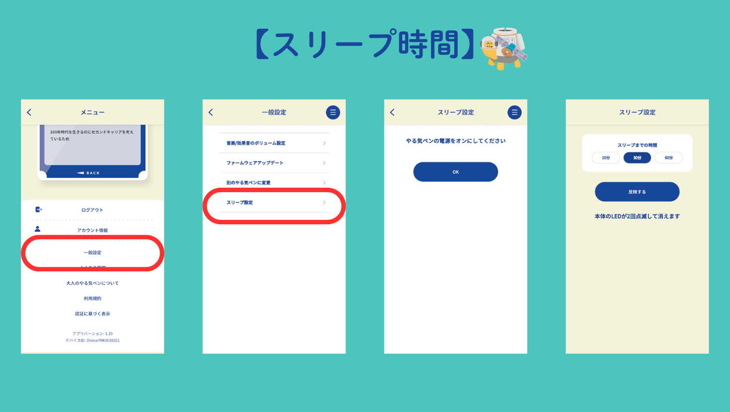 大人のやる気ペン本体のスリープ時間を選択できるようになりました。「10分」「30分」「60分」の3つから、ご自身の学習スタイルに合わせて設定できます。