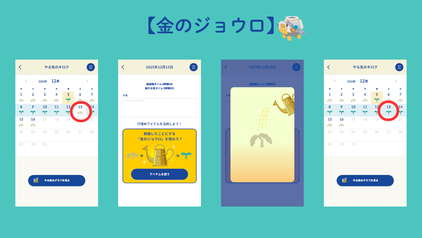 勉強できなかった日を穴埋めできるお助けアイテム「金のジョウロ」を追加しました。病気やイベントなどで連続日数が途切れてしまった場合でも、裏技要素として穴埋めが可能になります。