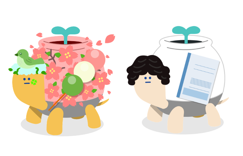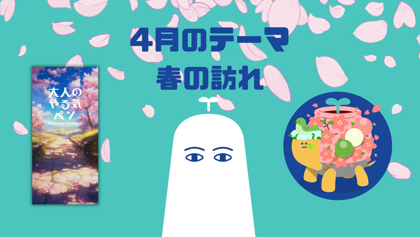 4月のテーマ:春の訪れ 満開の桜並木をゆくポット族たちが登場します 。春の柔らかな光の中で、今日一日の「やる気」を優しく後押しします。