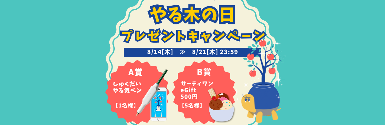 今月プレゼントする「やる木アイテム」はしゅくだいやる気ペン と アイスクリームギフト券!