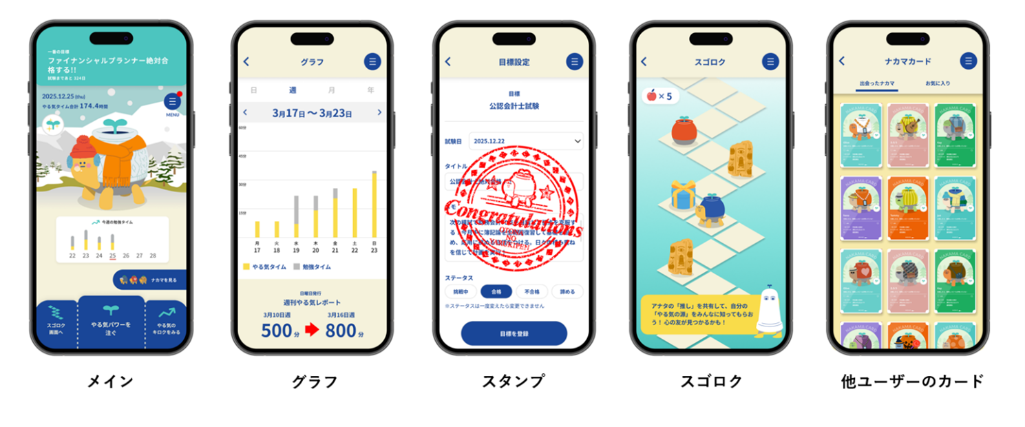 一週間の学習傾向に合わせ、「叱咤激励」のメッセージが届きます。頑張った時には、頑張っただけの褒め言葉が、サボってしまった時には、容赦ない叱責の言葉が。ついつい怠けてしまう気持ちにもしっかり寄り添います。また、自身のアバターが「やる気パワー」の量に応じてスゴロク形式のステージを進み、アイテムを獲得。季節や自分の好みに合わせて、育成シミュレーション感覚でアバターをカスタマイズできます。アイテムは100種類以上、順次追加予定です。
