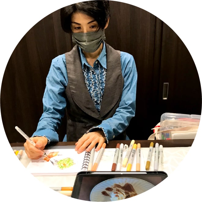 食べ物を描くとき、着色の前に細かく線を描き込むことにより、リアリティを出しています。着色は色の重ね方を工夫して、こんがり美味しそうな質感に!光沢もしっかり描き、ジューシーさを表現しています。