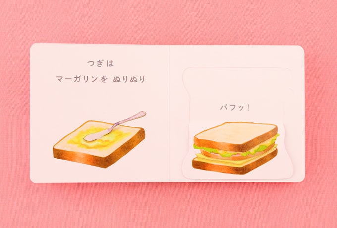 しかけ扉をめくっていくと、リズミカルにおべんとうが完成します。