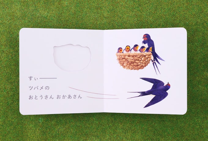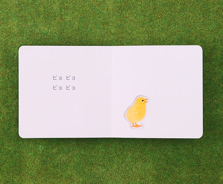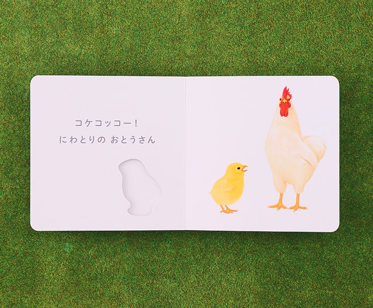 しかけ扉をめくると、鳴き声と一緒に親子が登場します。