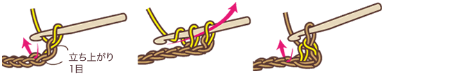 - <くさり編み> 側面の指定の位置に糸をつけ(外側の糸端を使うとよい・❷)、「くさり編み」を40目編み、指定の位置に「引き抜き編み」を編んで糸を切る(❸)。反対側も同様に編む。