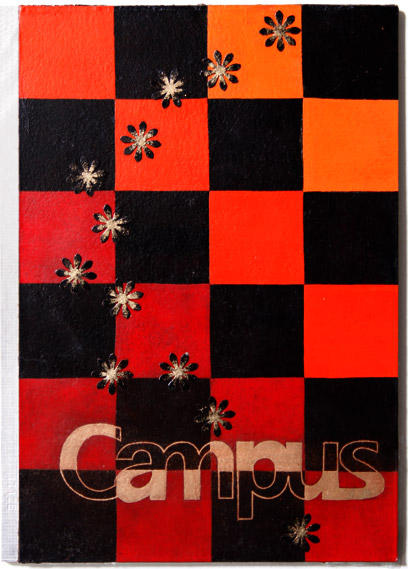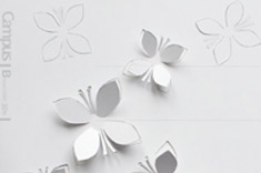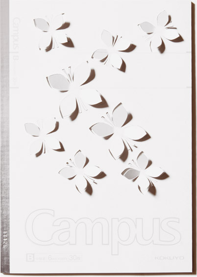 白地にキラリとしたシルバーの背表紙、Campusのアウトラインが美しいノートに、チョウチョを描きフワッとたちあげる。光を浴びて陰影が空を舞う。