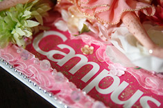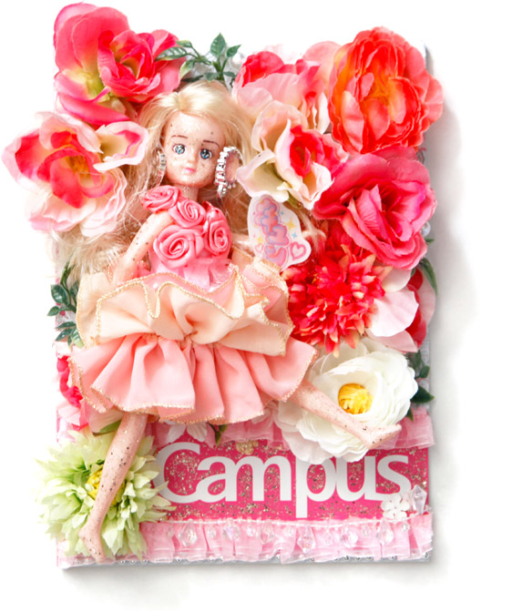 100円ショップで目についた"かわいい"、"女の子"、"乙女"なものを思いつくままに敷き詰め、立体的なデコレーションノートにしました。