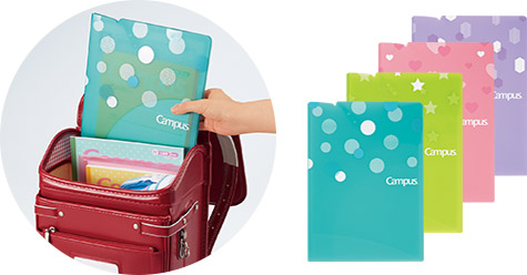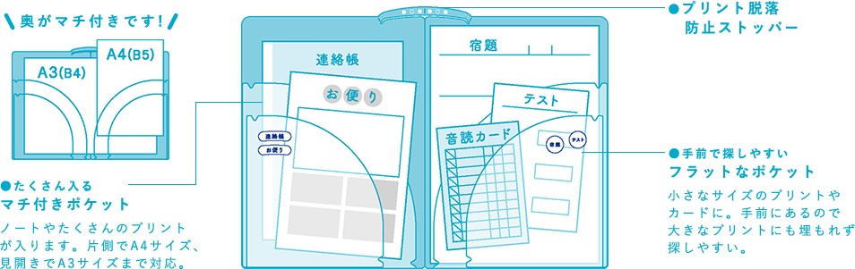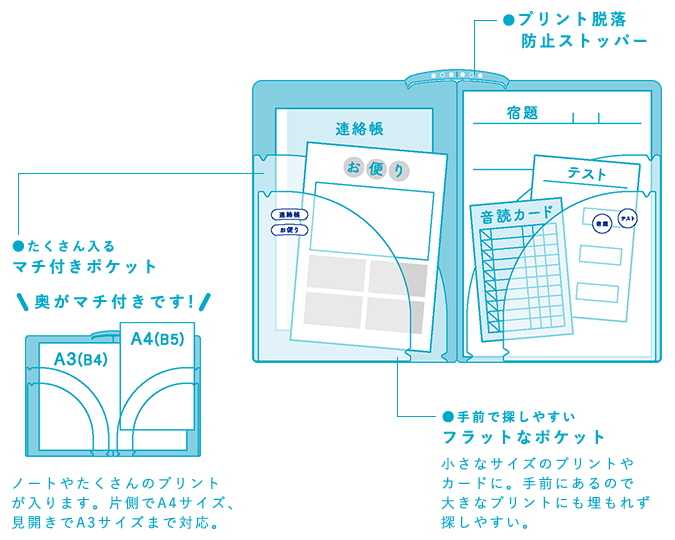 折れ曲がりにくい丈夫な表紙で、連絡帳も入るマチ付きポケットと小さなサイズのプリントやカードの収容に便利な出し入れしやすい浅めのポケット付き。「脱落防止ストッパー」があるため逆さにしてもプリントが落ちにくく、お子さまも使いやすい!