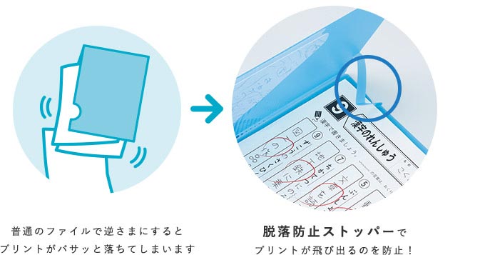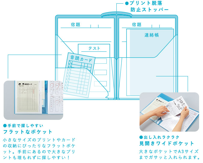折れ曲がりにくい丈夫な表紙で、出し入れが簡単な大きなワイドポケットと手前で探しやすいフラットなポケット付き。「脱落防止ストッパー」があるため逆さにしてもプリントが落ちにくく、お子さまも使いやすい!