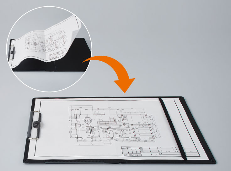 A3展開時も筆記面が垂れ下がりにくく、筆記しやすい構造なので、立ったままでの記入にも適しています。また、折り線がフラットで、段差が気にならずに記入できます。