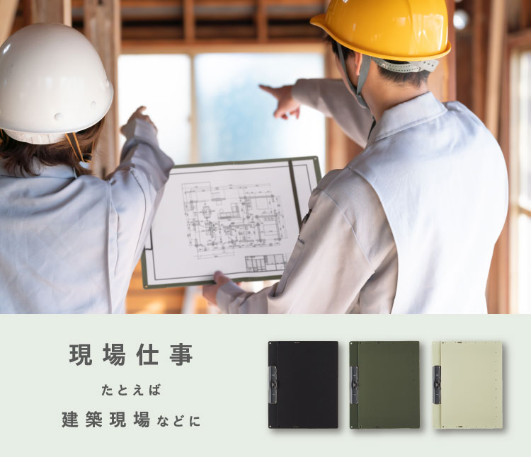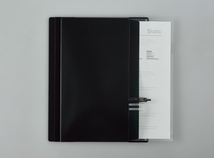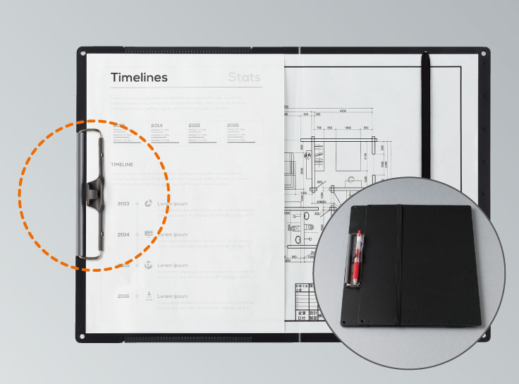 屋外で書類が風にあおられにくくするためのゴムバンド付き。表紙止めにもなるのですっきりと持ち運べます。