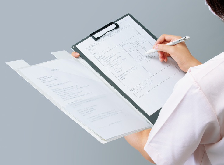 左側のポケット1枚目が透明なので、入れた書類を確認しながら右側に挟んだ書類に記入でき、業務効率がアップします。