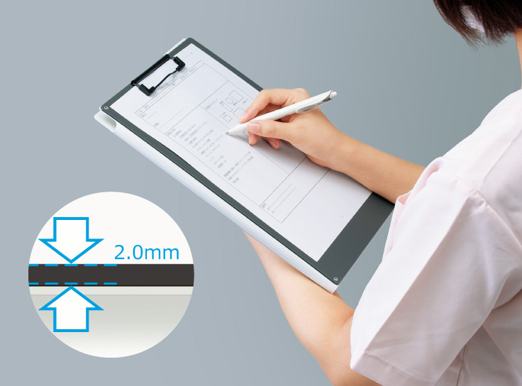 筆記面は厚めのボード(2.0mm)で補強。立ち作業でもたわみにくく、しっかりと書き込めます。