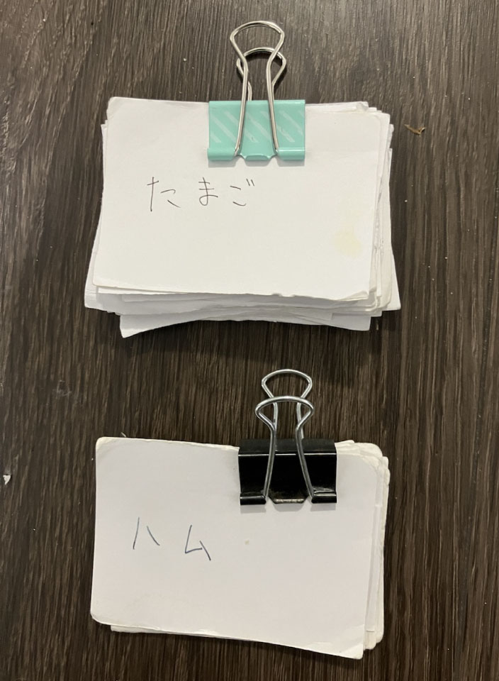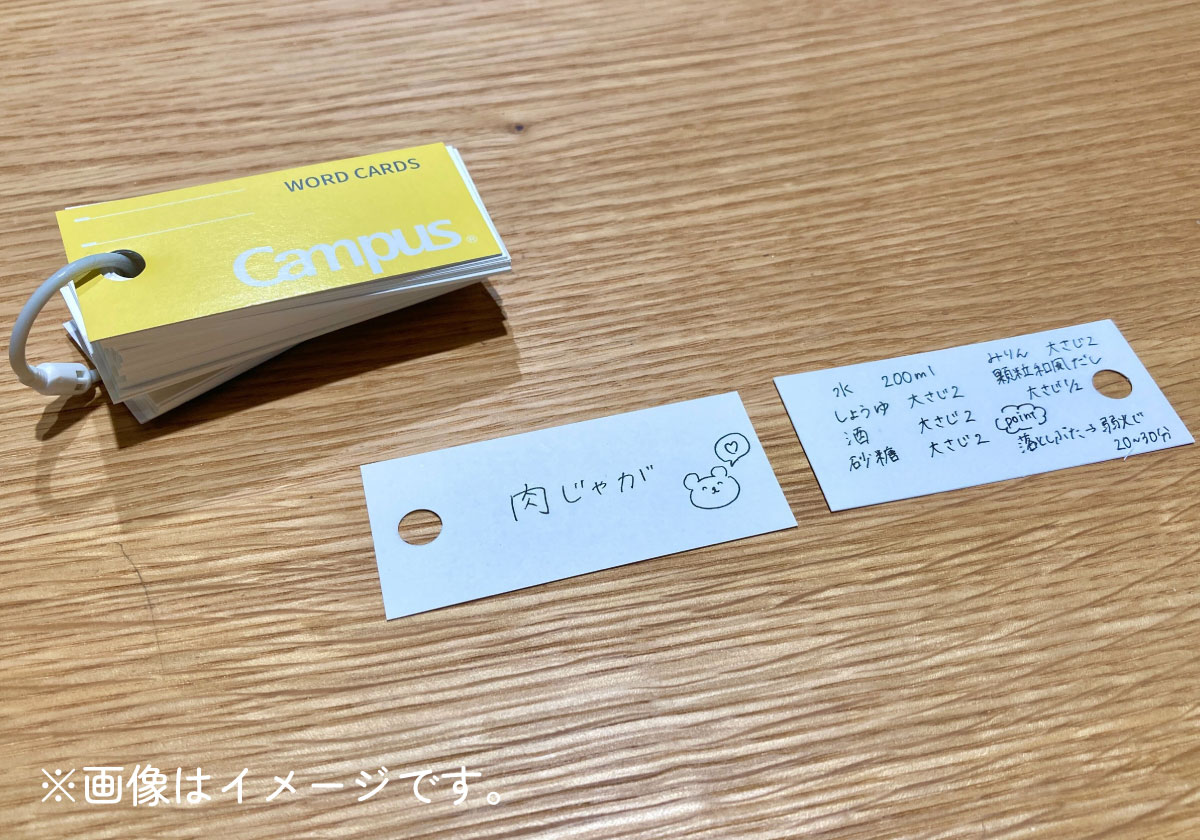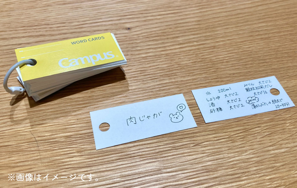 家族もお気に入りのレシピ。すぐ調味料の分量を忘れてしまうので単語帳の表にメニュー、裏に簡単に分量と調理ポイントをまとめて綴じています。単語帳は小さいから台所の引き出しにしまっても邪魔にならなくてオススメです。