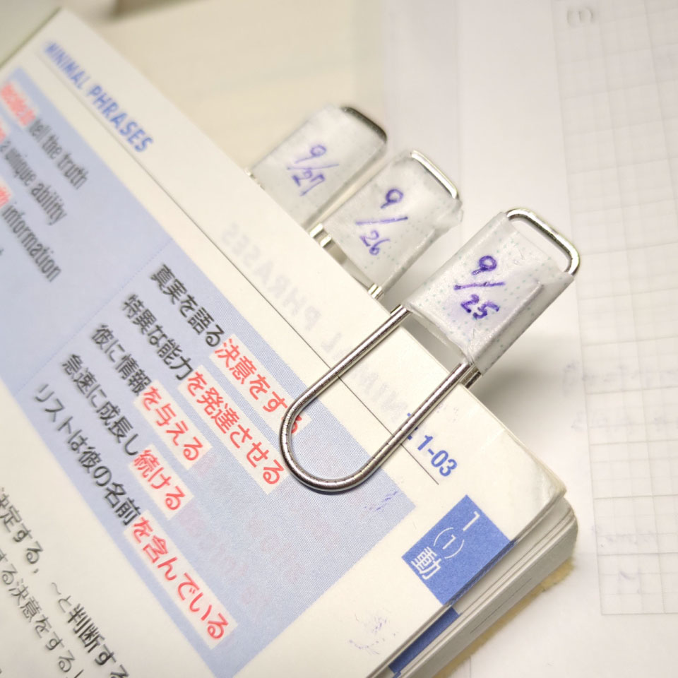 覚えるためには何度も見ることが必要だと思いますが、最後にいつ見たのか、次はいつ見るべきなのかを覚えておくことは大変です。 なので、ゼムクリップとマスキングテープを付箋のように使っています。 付箋だとカバンの中でぐしゃぐしゃになったり、剥がれていたりしますが、それを防ぐためにゼムクリップを使用します。 一度に覚えたい範囲分をゼムクリップで挟み、マスキングテープに日にちを書いてゼムクリップに貼ります。
