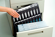 キャビネットや引き出しにスッキリ収まるサイズ。本体は樹脂製なのでスチール製に比べて軽量です。