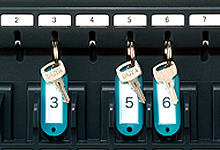 本体の外側、中のクリップ部、キーホルダー型名札それぞれにラベルを設けました。鍵を探しやすく、掛け間違いも防ぎます。