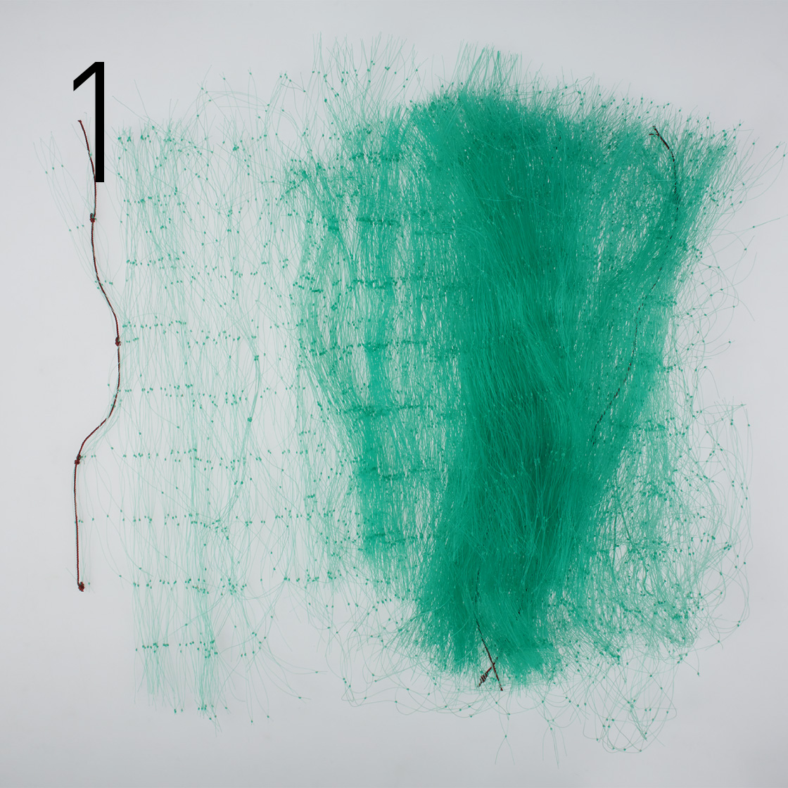 ペレットから作られた再生ナイロン糸とポリエステルの糸を製織し、廃棄漁網を原料に含む生地を製造します。
