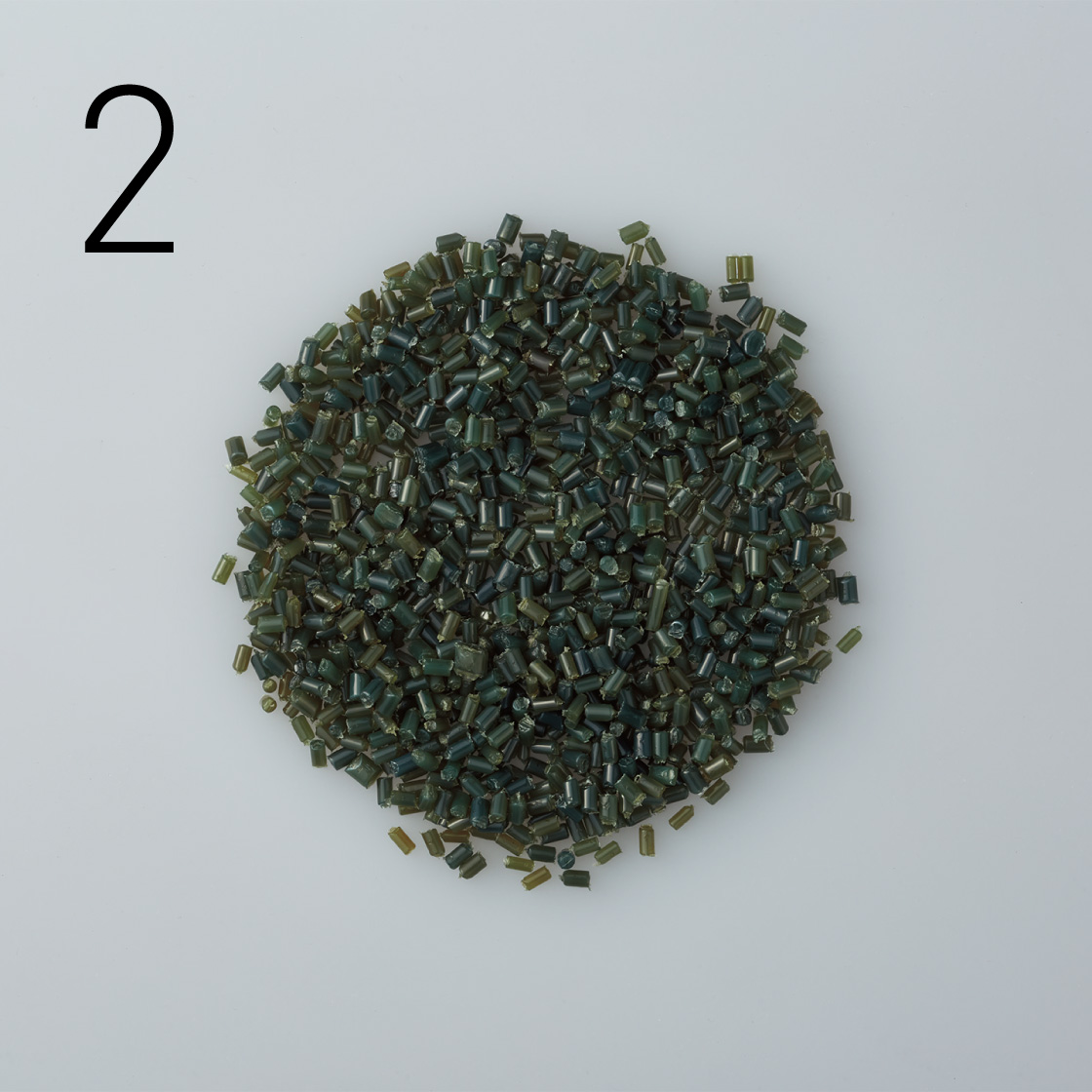 圧縮された漁網は細かく粉砕され、再生プラスチックのペレット(REAMIDE®)に加工されます。