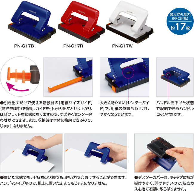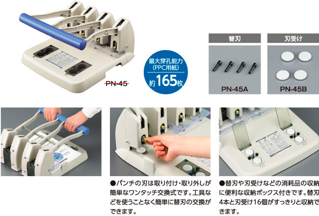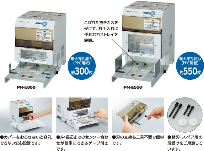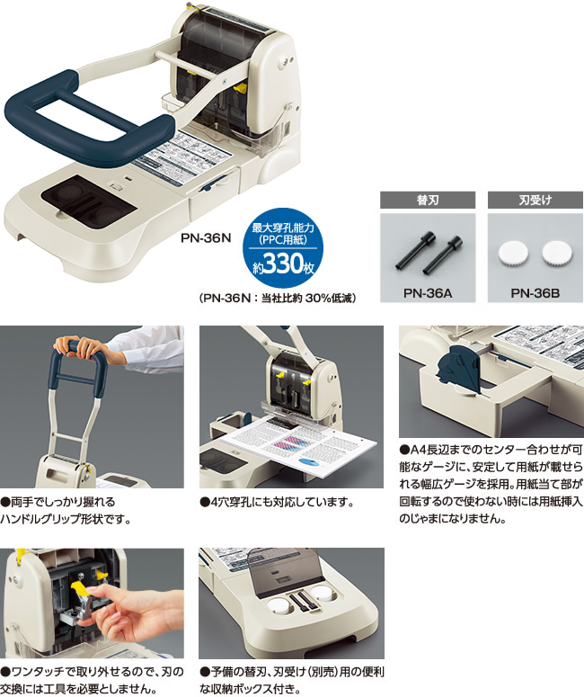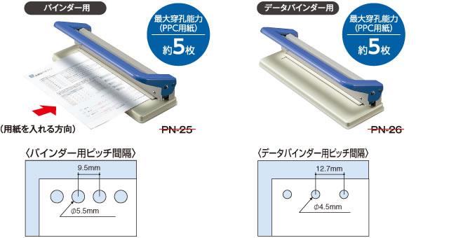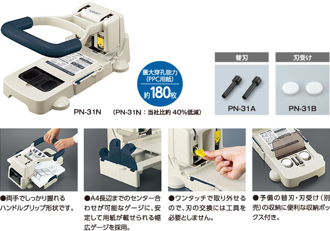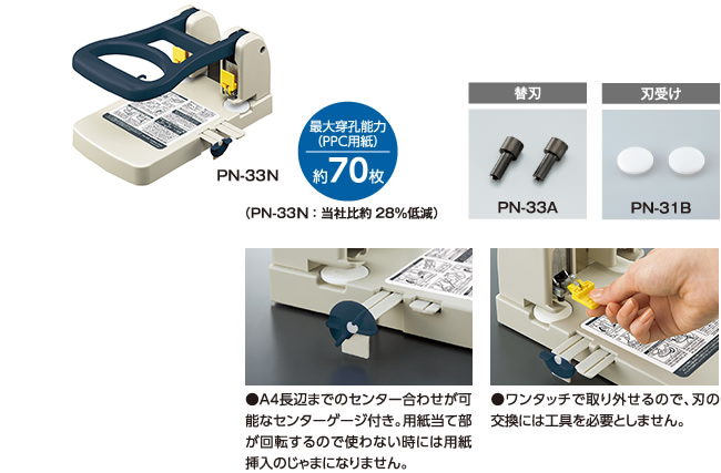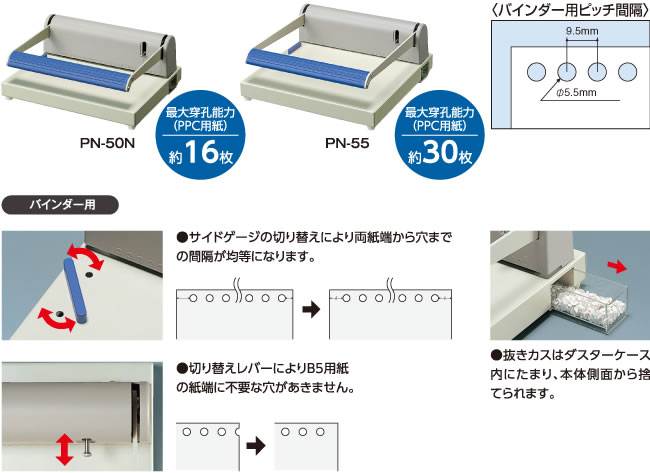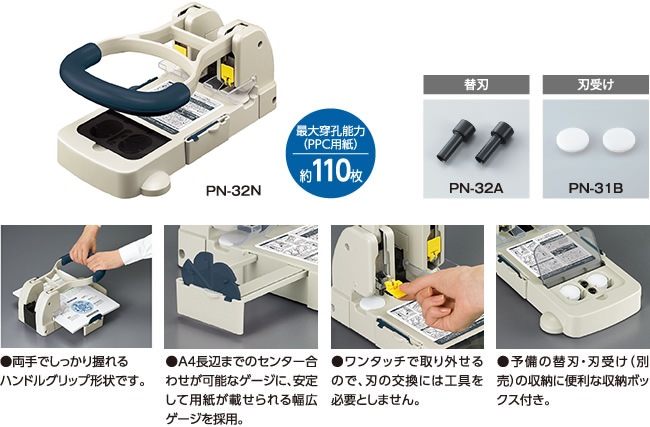 - 最大穿孔能力/PN-50N:PPC用紙約16枚、PN-55:PPC用紙約30枚