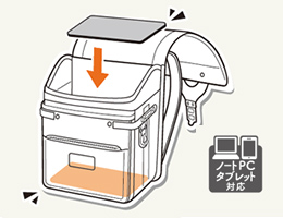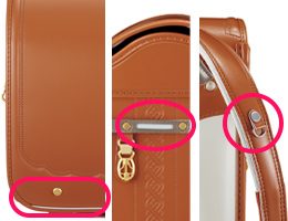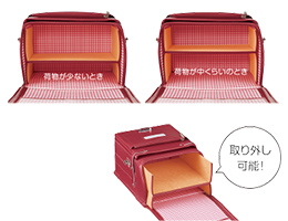 - スマート大容量、フィットちゃん、ワンタッチロック、スライドロック、持ち手付き、2段階中仕切り付き、反射鋲・反射帯付き、やわらかナスカン(左右2個)、肩ベルトDカン(左右2個)、やわらか肩ベルト