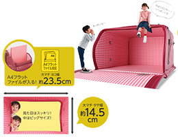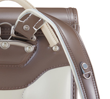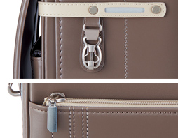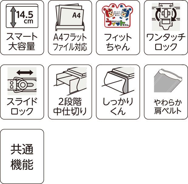 - スマート大容量、フィットちゃん、ワンタッチロック、スライドロック、持ち手付き、2段階中仕切り付き、反射鋲・反射帯付き、やわらかナスカン(左右2個)、肩ベルトDカン(左右2個)、やわらか肩ベルト