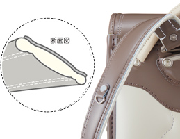 肩ベルトの端までクッションの幅を広げることで、肩への当たりをやわらかくしました