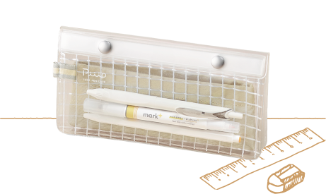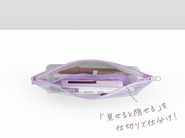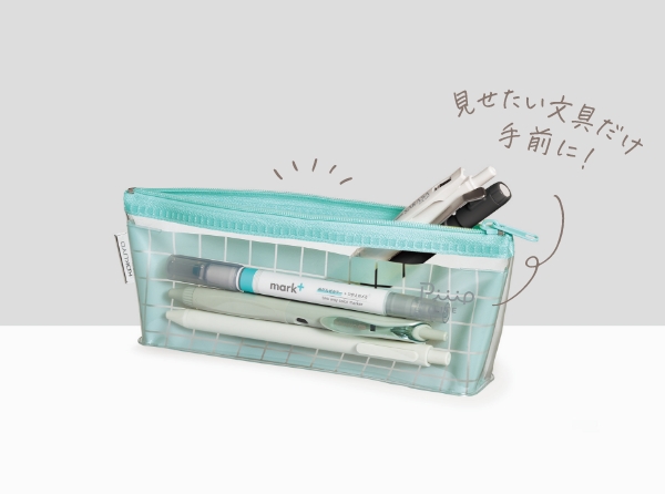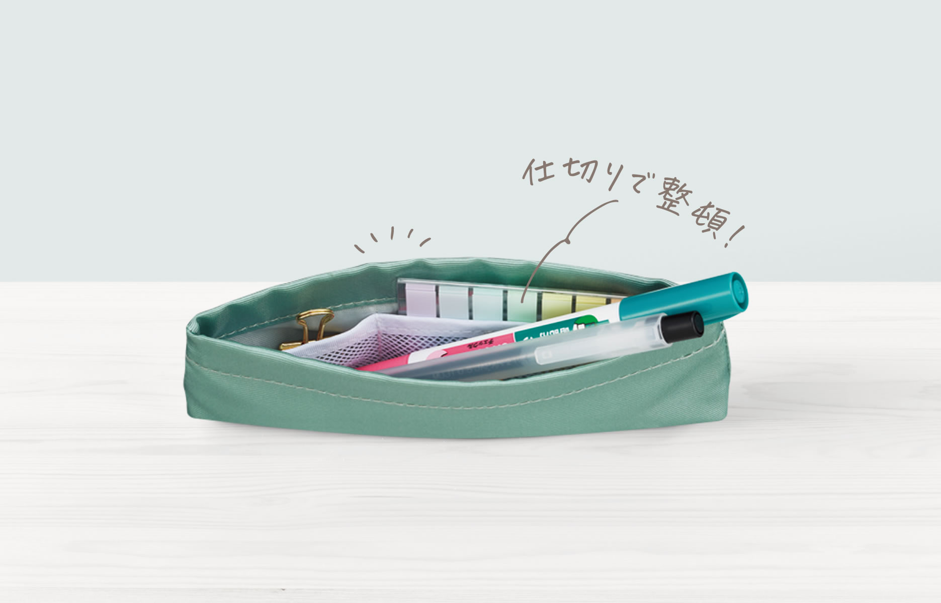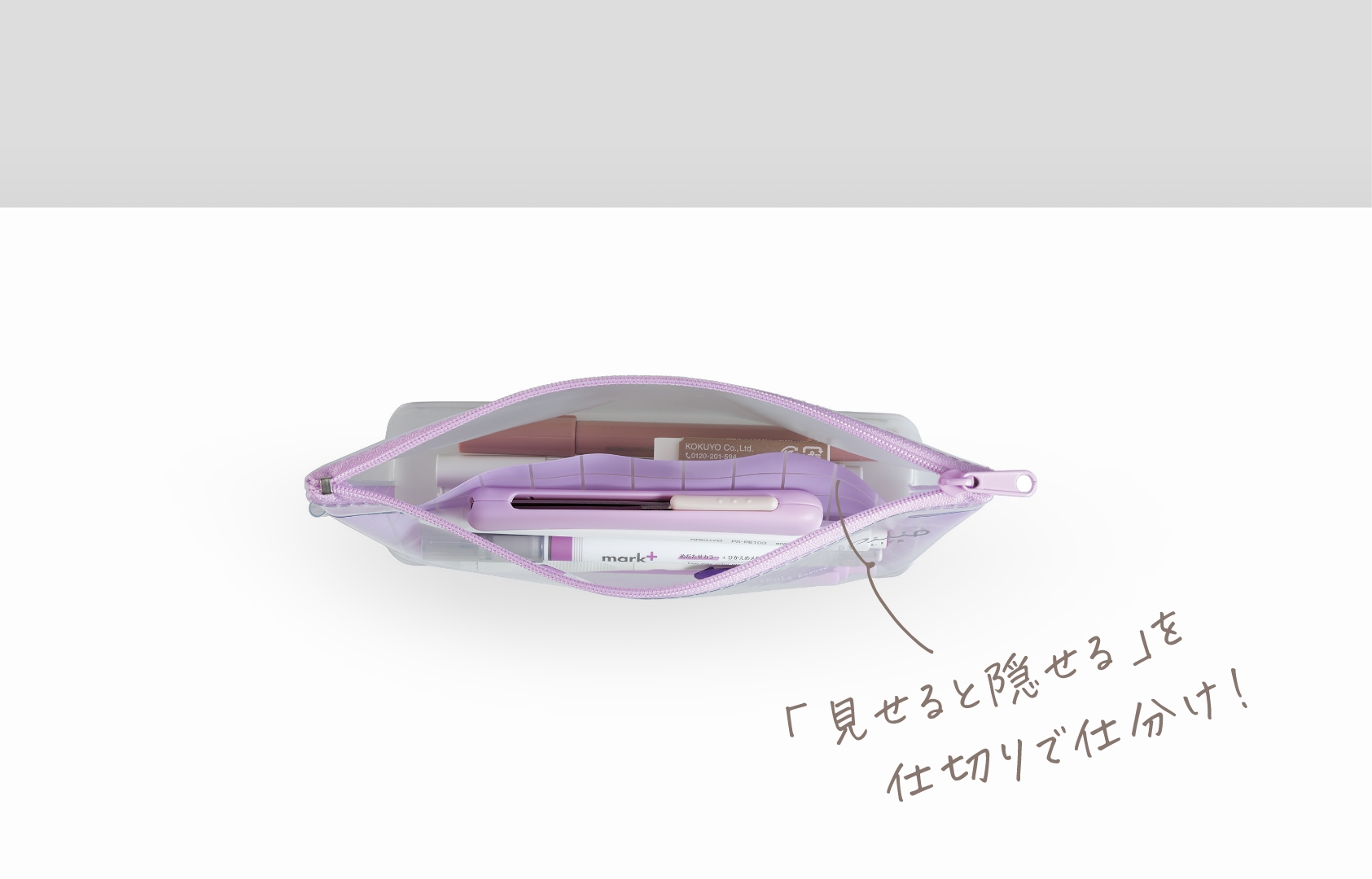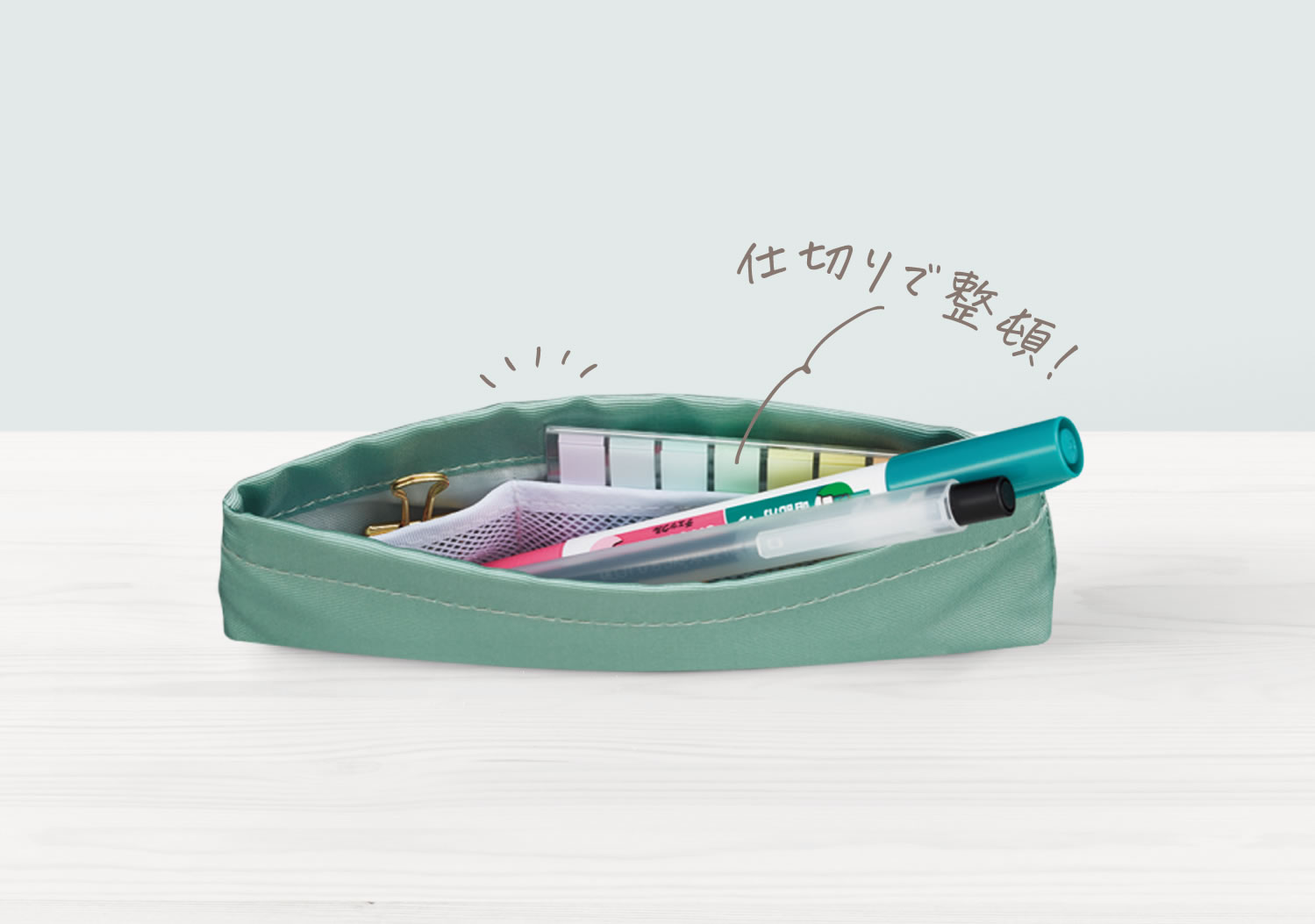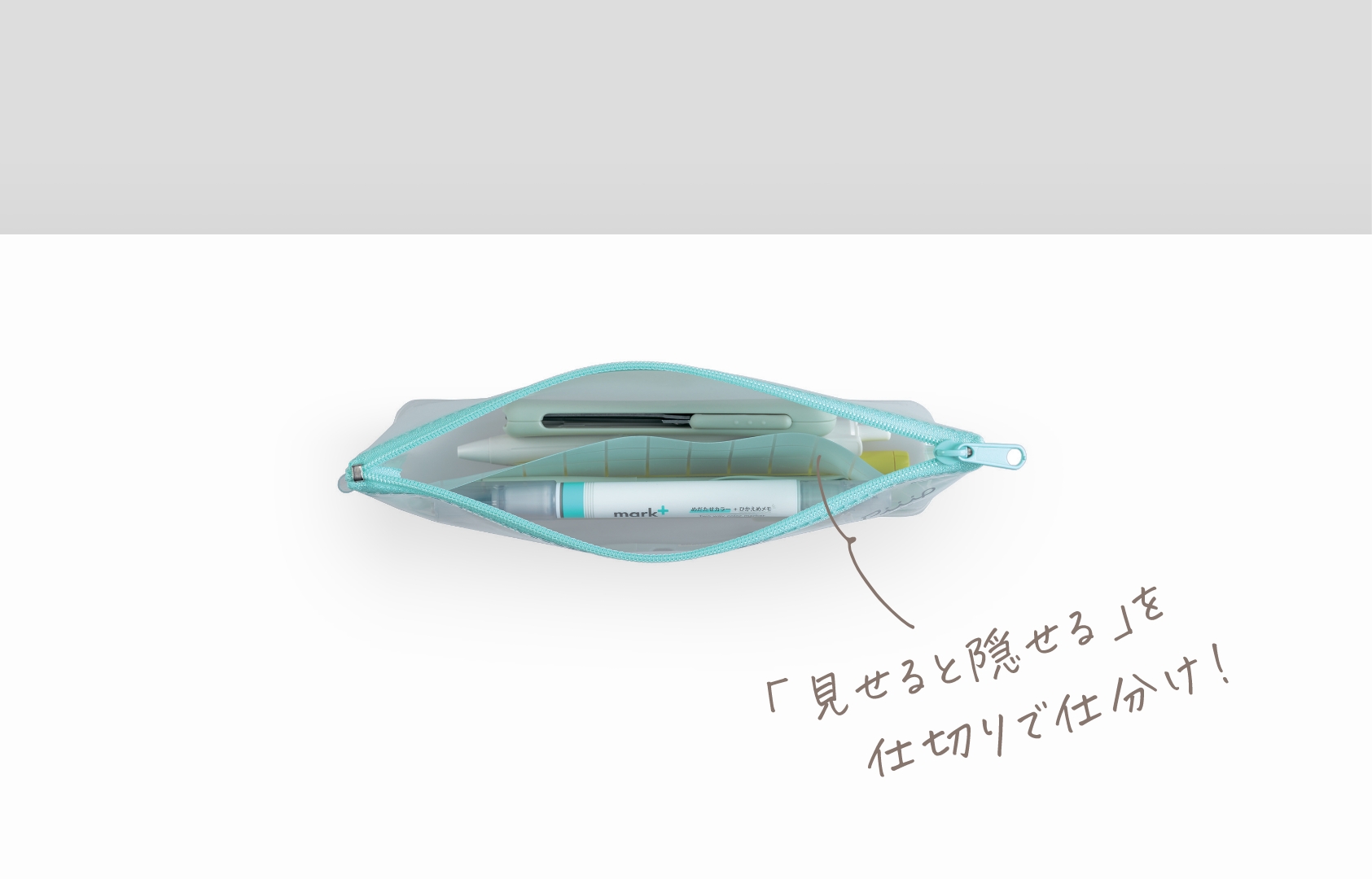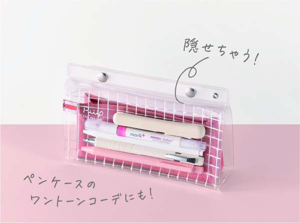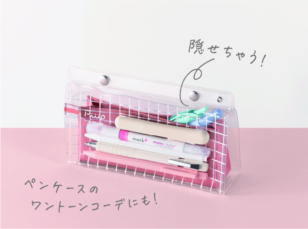 暗記ペンなどの実用的な文具は、インナーケースの中 or 仕切りの向こうに隠すと、ワントーンコーデが簡単につくれる!
