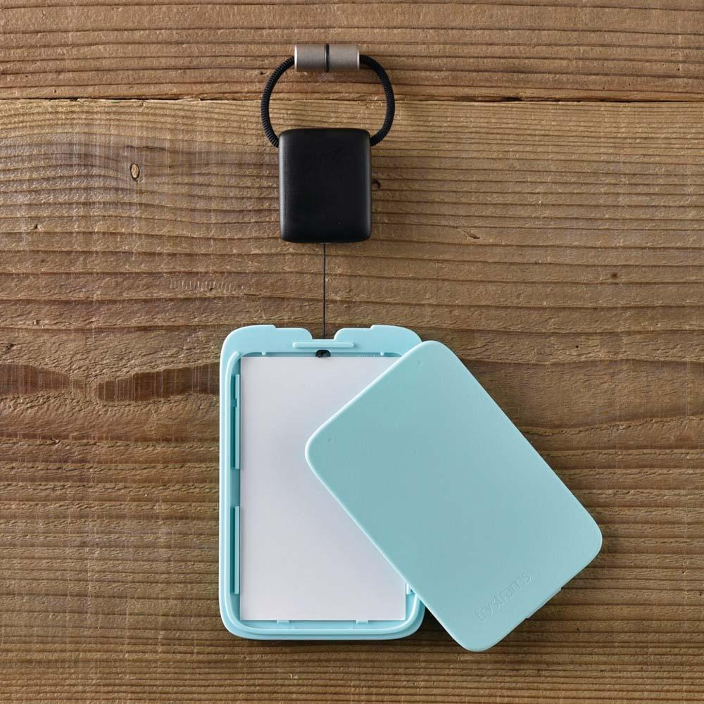 透明窓とフレームが作り出す層の奥行きが美しいカードケース、しっかり取り付けられるネジ式ストラップ、カードを保護する樹脂製ながら薄くて軽いカードケースボディ、入退室時の社員証や交通などの非接触型ICカードに便利な伸縮するリール、柔軟性素材の裏蓋、red dot design award:product design2011、 iF product design award 2011[office/business]