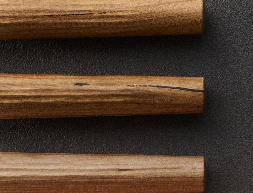私たちは、桜材が持つ「ガムポケット」などの豊かな表情を自然の中で生き抜いてきた力強さと優しさの証と捉え、大切にしながら一つ一つ加工しました。