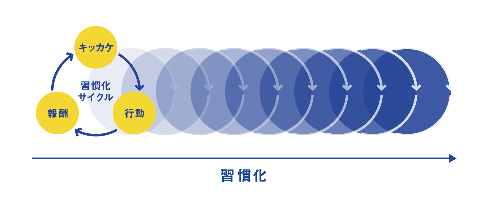 習慣化のポイントはとても単純です。それは「きっかけ→行動→ごほうび」のサイクルを何度も回すことです。たとえば、午後3時という「きっかけ」に対して、おやつを食べるという「行動」をすると、美味しいという「ごほうび」が得られます。このサイクルを何度も繰り返すと、3時のおやつが習慣になるというわけです。